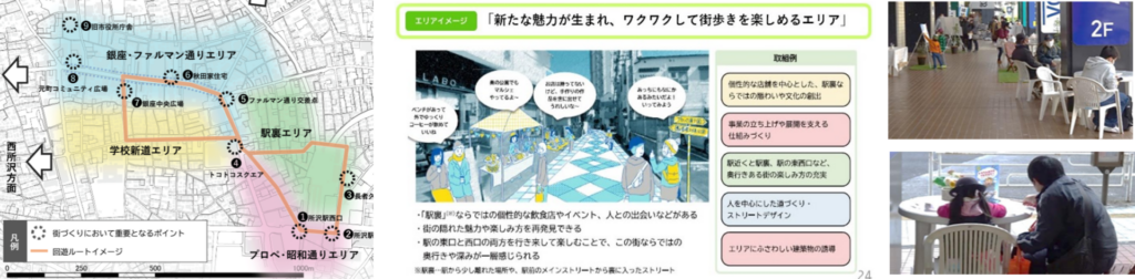 グランドデザインの全体方針:4エリアごとのエリアイメージ、街づくりにおいて重要となる10箇所程度のポイントと回遊ルートを設定し、取組方針等を明示しました。