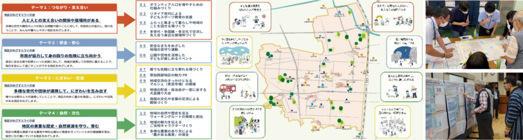 草加駅の西部と市街化調整区域を含む市北東部の2地域で、都市計画マスタープランに掲げる地域ごとの将来都市像実現に向けた、行政と地域との協働による行動計画「コミュニティプラン」を作成しました。