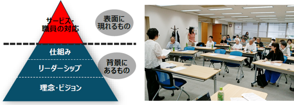 サービスの質の向上を図る際には、事業所独自の「めざす姿」に基づいて、活かすべき強みと克服すべき弱みを明らかにします。その際に、表に現れる「利用者や職員の言動」と、その背景にある「理念・リーダーシップ・仕組みの特徴」の関連に着目します。このため、評価は一貫して、組織担当と福祉担当のチームで、合議により行います。